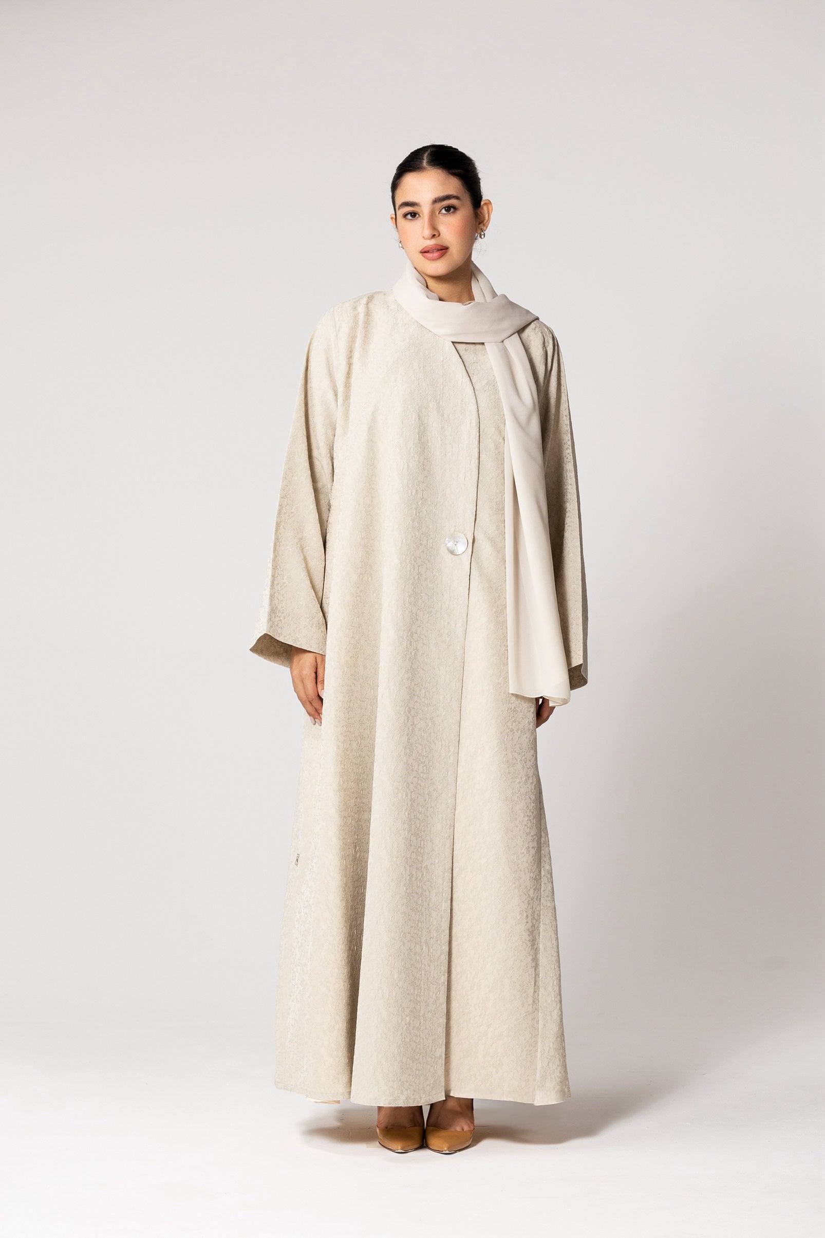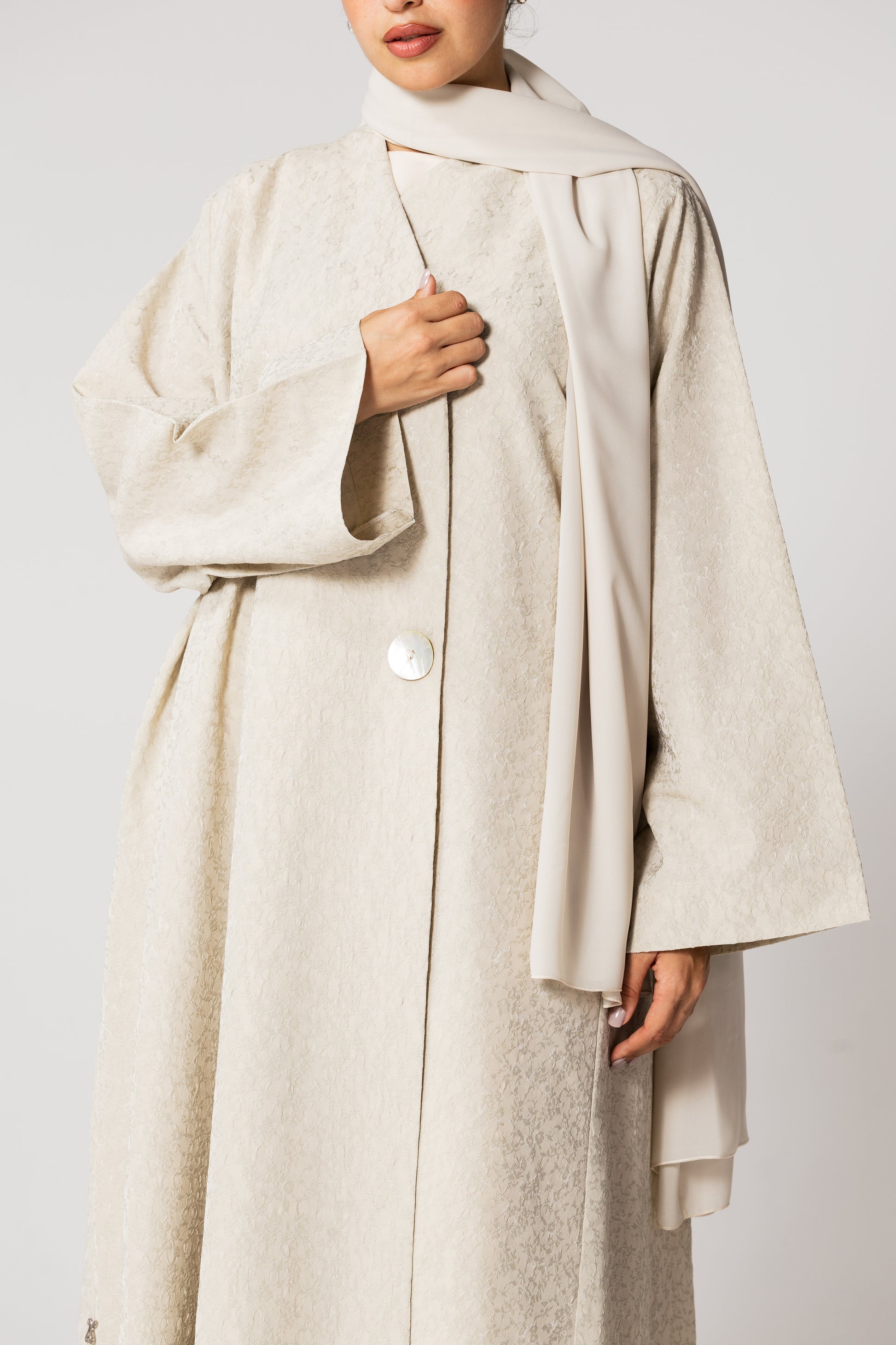 Indulge in the luxurious Linen like jacquard abaya with delicate mother of pearl buttons. Elevate your wardrobe with this sophisticated and timeless piece, perfect for any occasion. Experience the exclusive blend of comfort and elegance with Veloura.